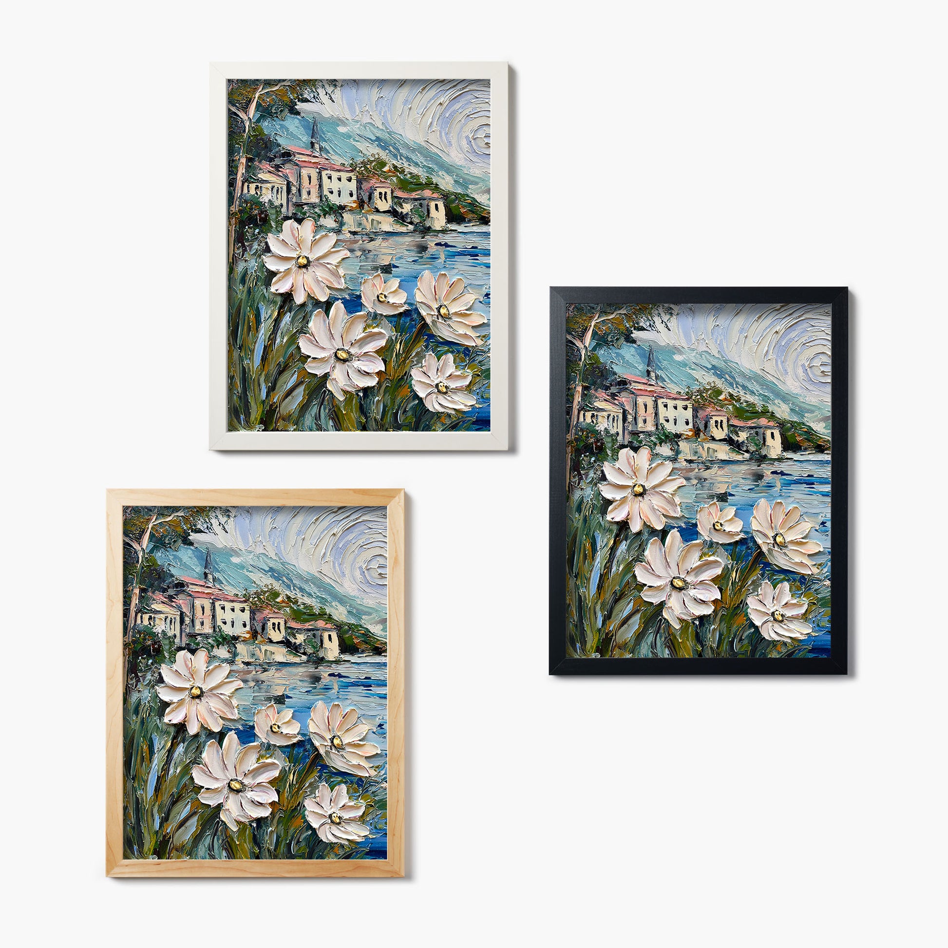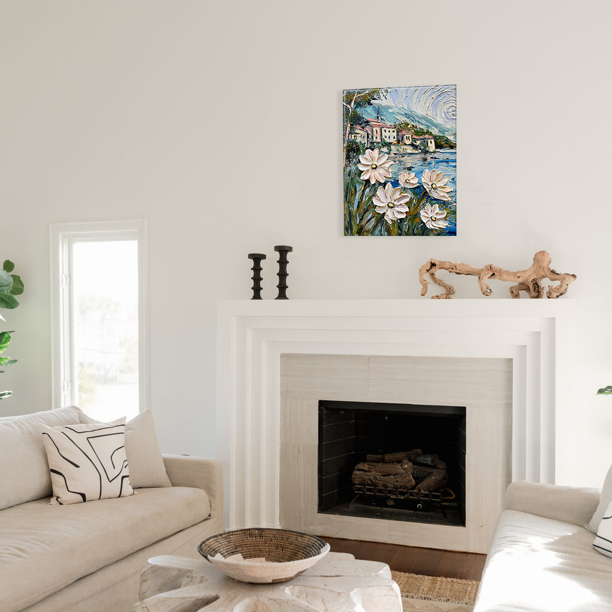Lisa Elley paints Lake Como in bloom. Sunlit petals lean toward shimmering waters, and every brushstroke feels like a breeze. Give your walls that Italian summer feeling with this traditionally painted piece printed on glass.