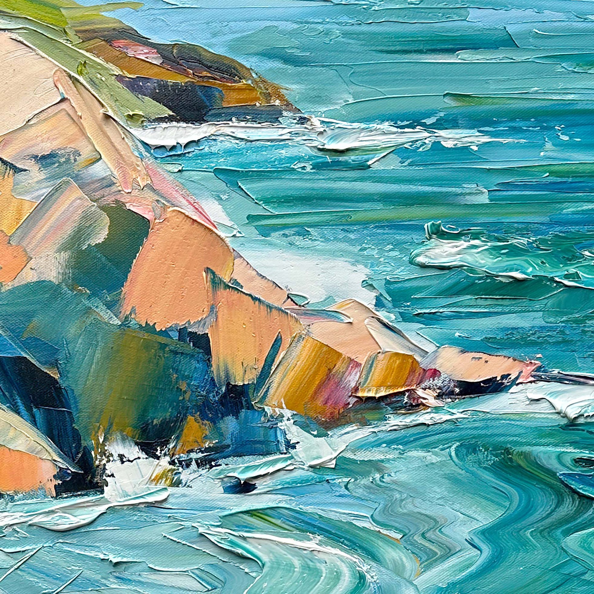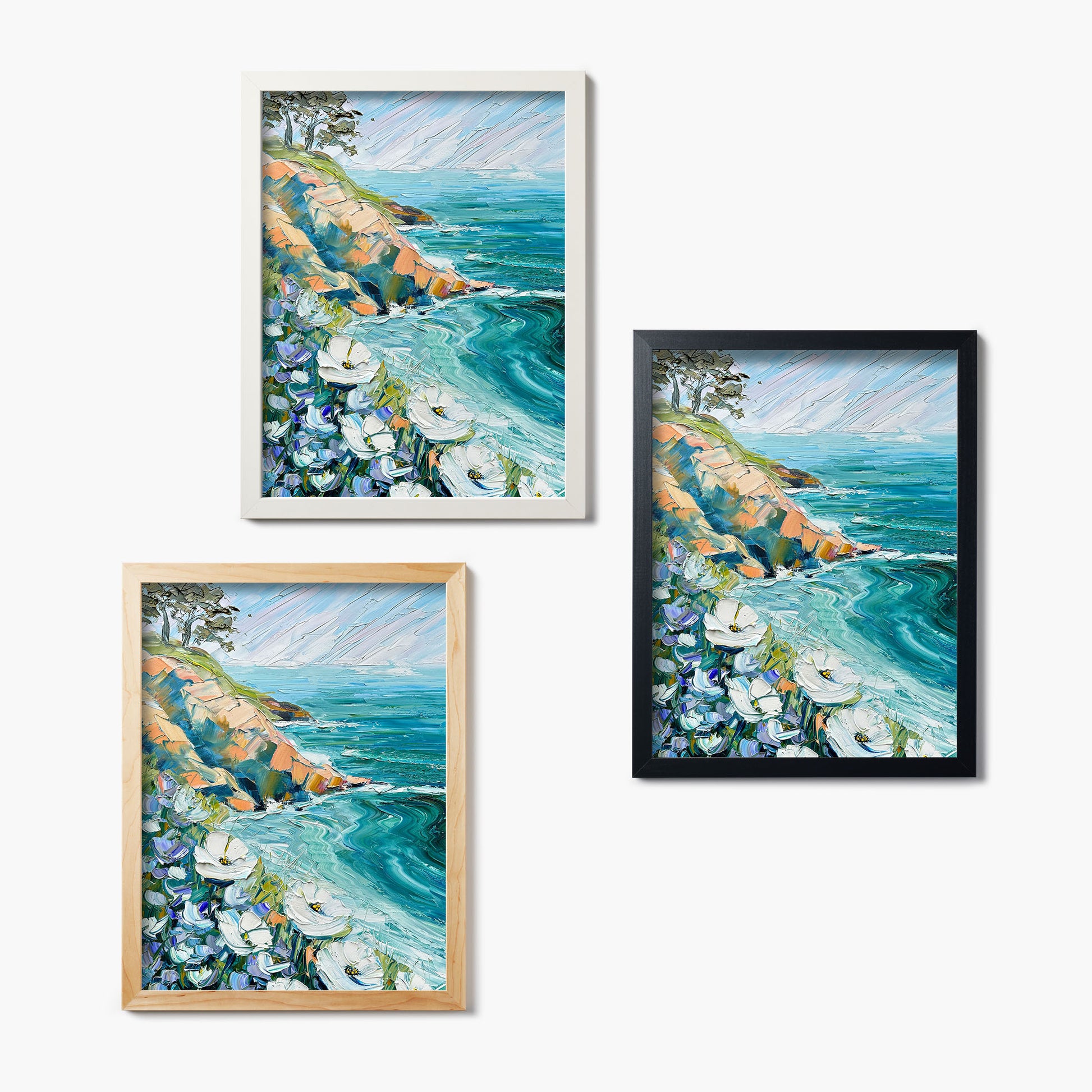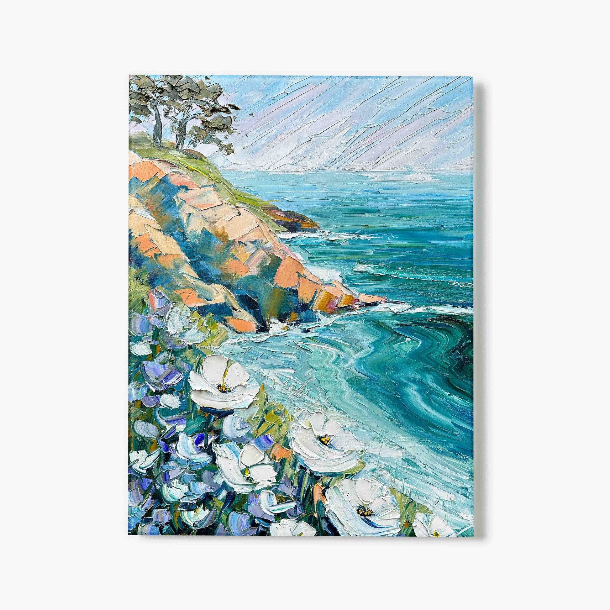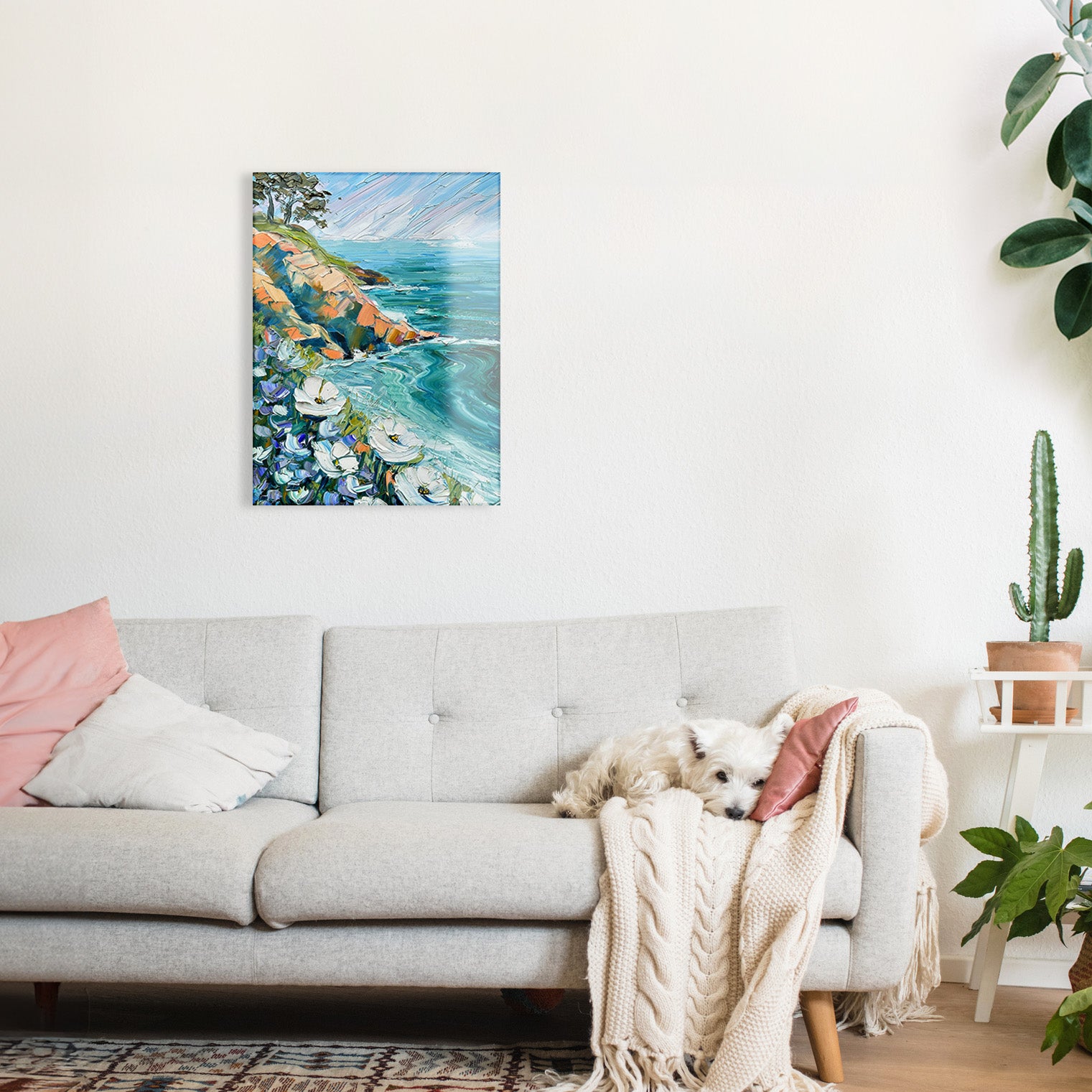 Bold petals, rugged cliffs, restless waves. Lisa Elley brings the magic of the shoreline to life in every stroke. Bring the coastal drama to your walls with this vibrant cliffside painting printed on glass.
