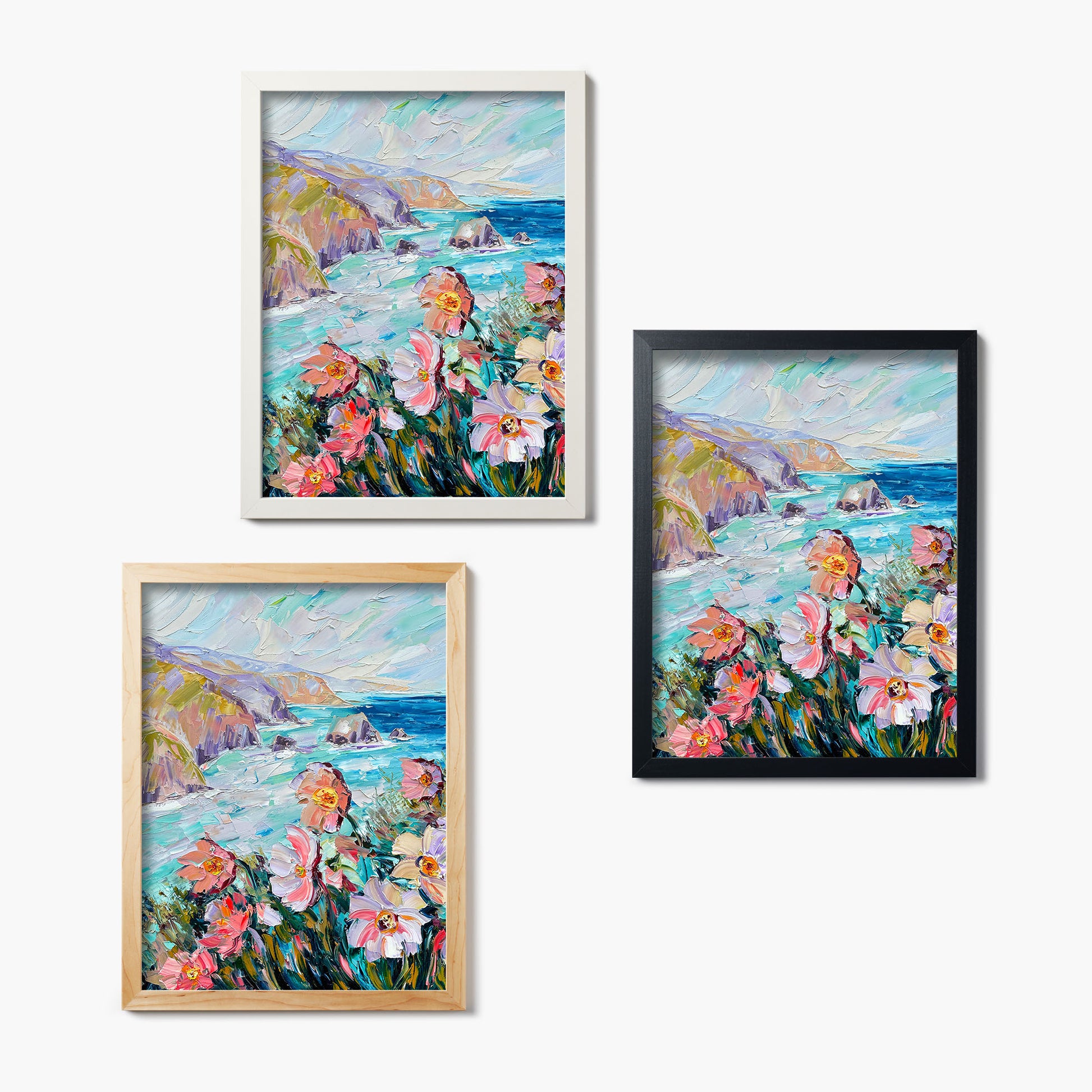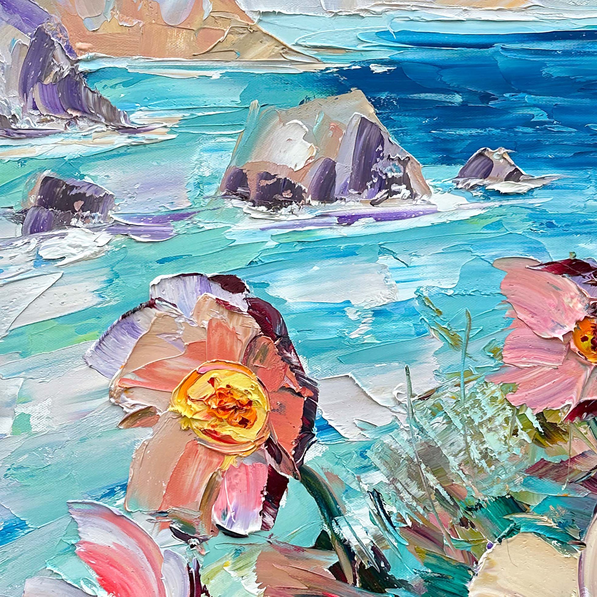 Windblown pink petals practically dance in this energetic coastal painting from Lisa Elley. Her impressionistic palette knife strokes shape candy-colored cliffs that jut out from a cheerfully turquoise ocean. A part of our Dopamine Decor collection, this piece is a little tropical, seriously magical, and will undoubtedly stand out on your walls.