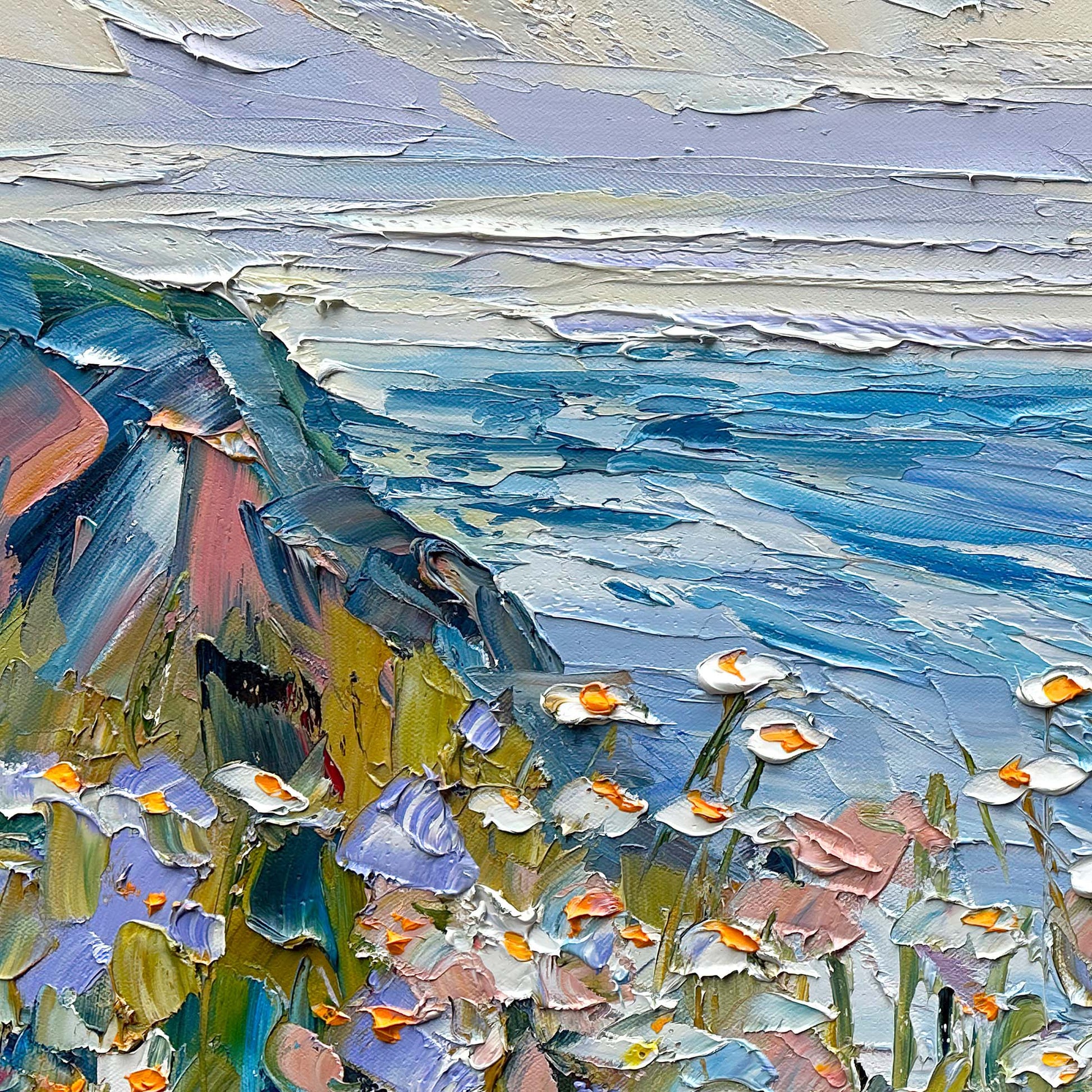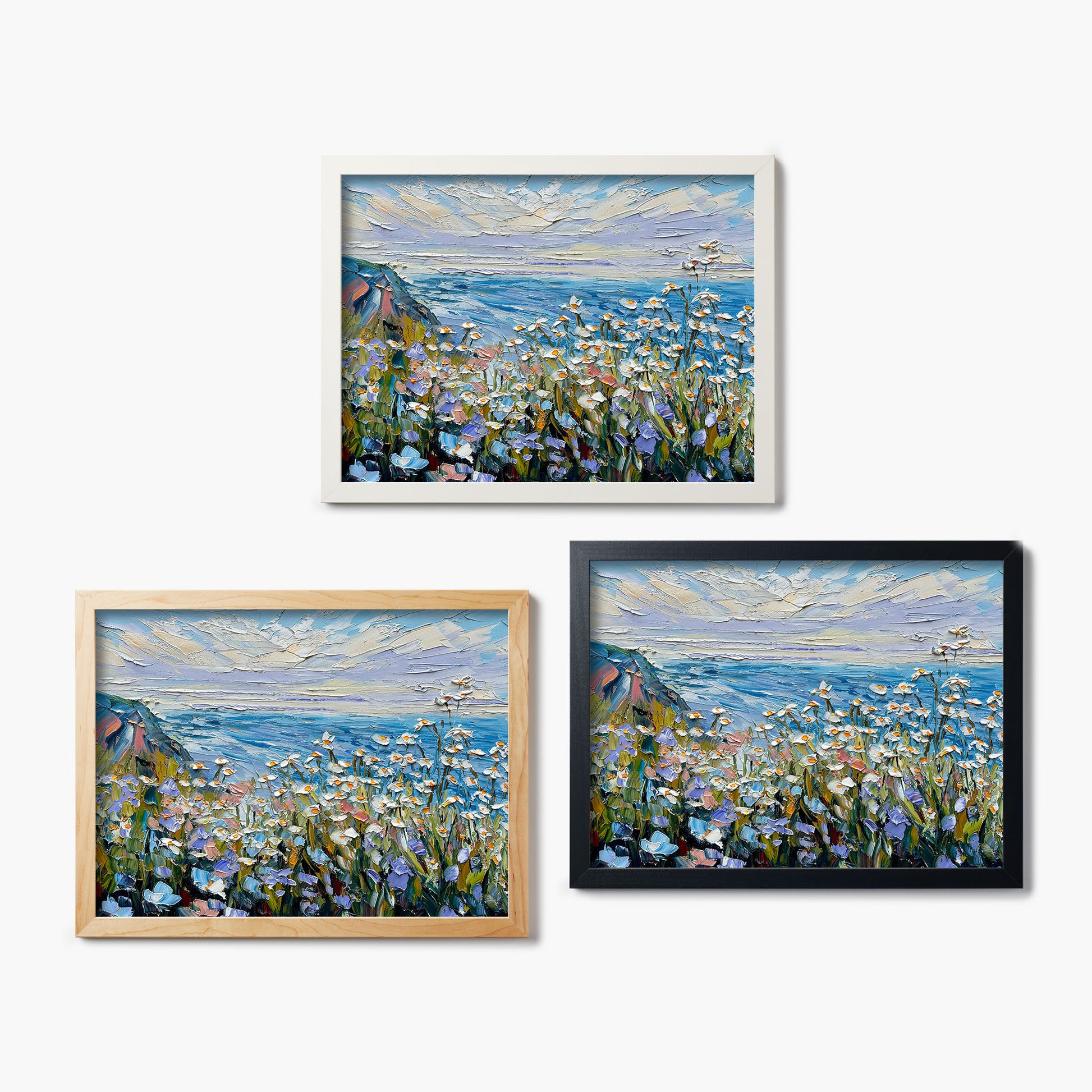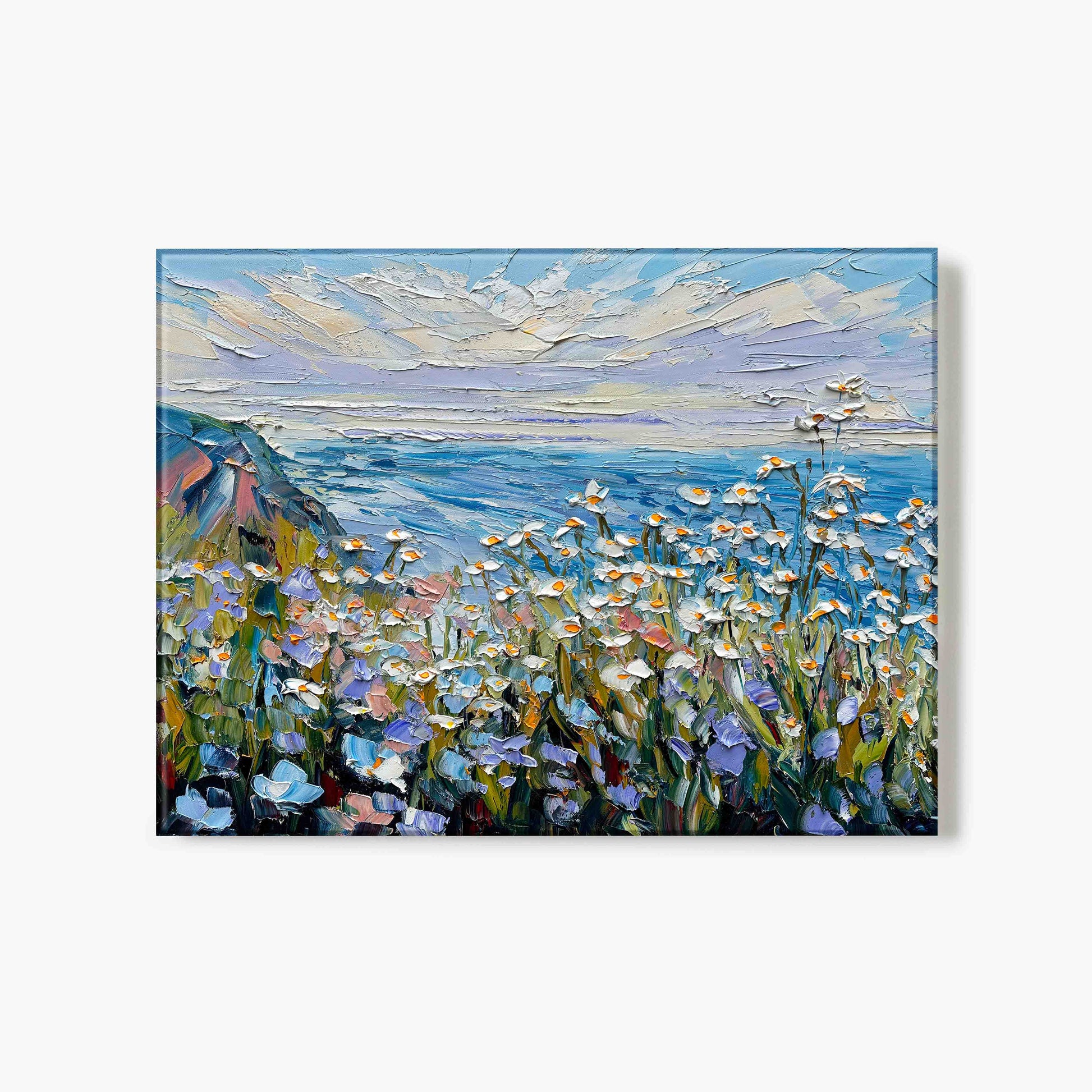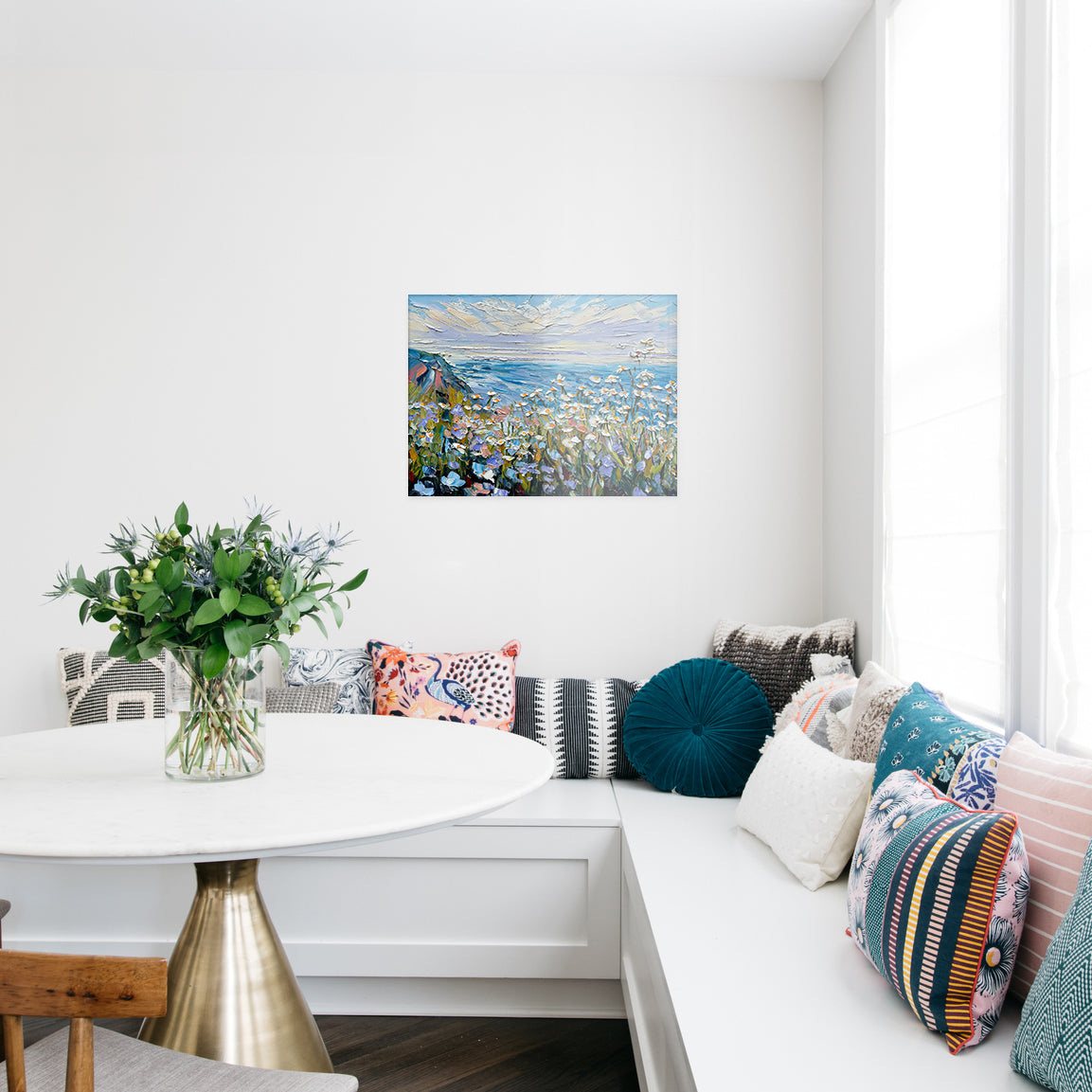 Where wildflowers meet ocean breeze. Lisa Elley turns a coastal view into a romantic painted landscape. Let your wall bloom with each joyfully painted petal printed on glass.