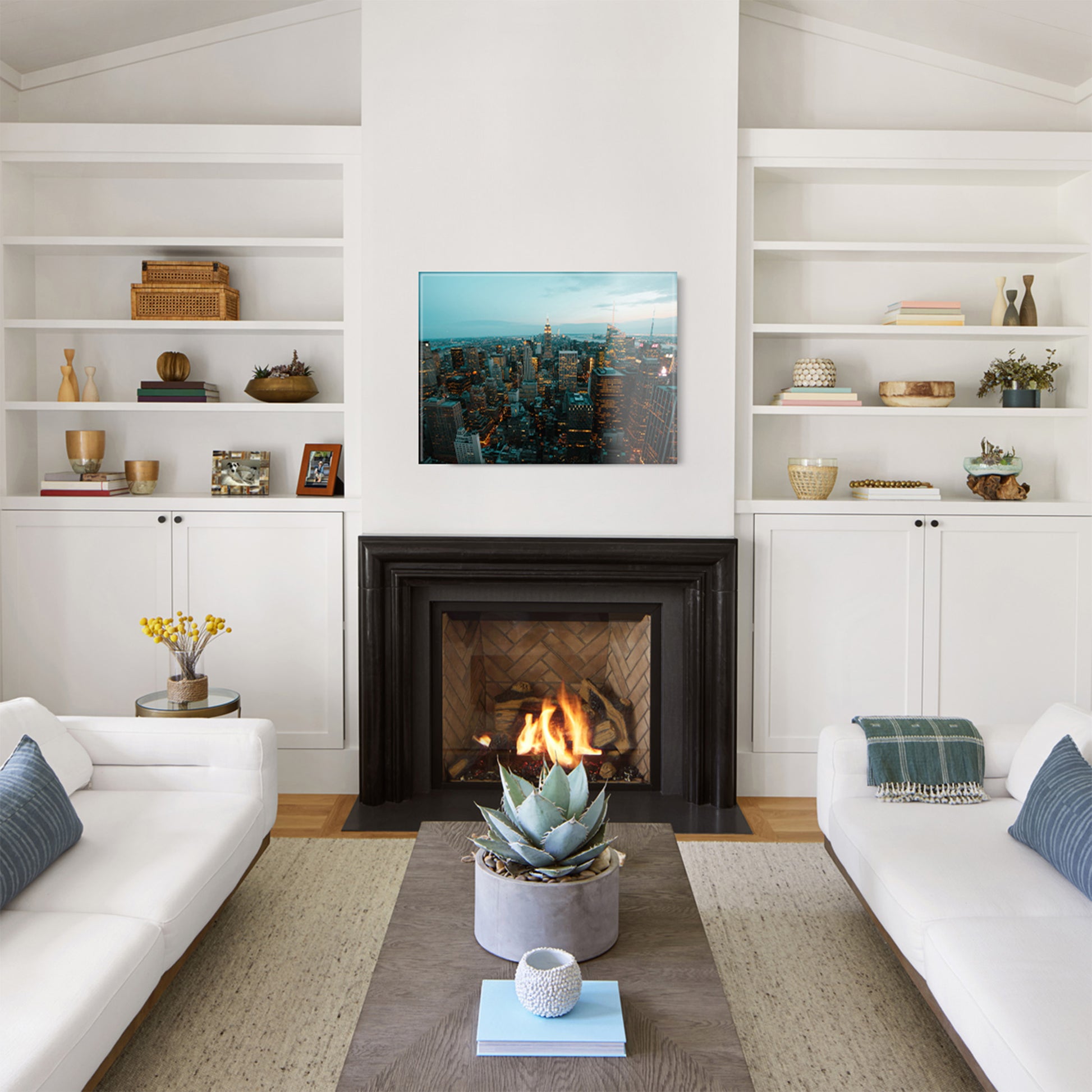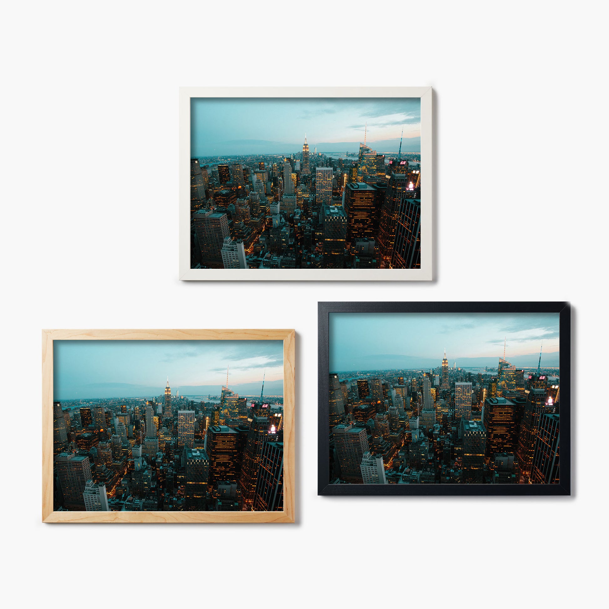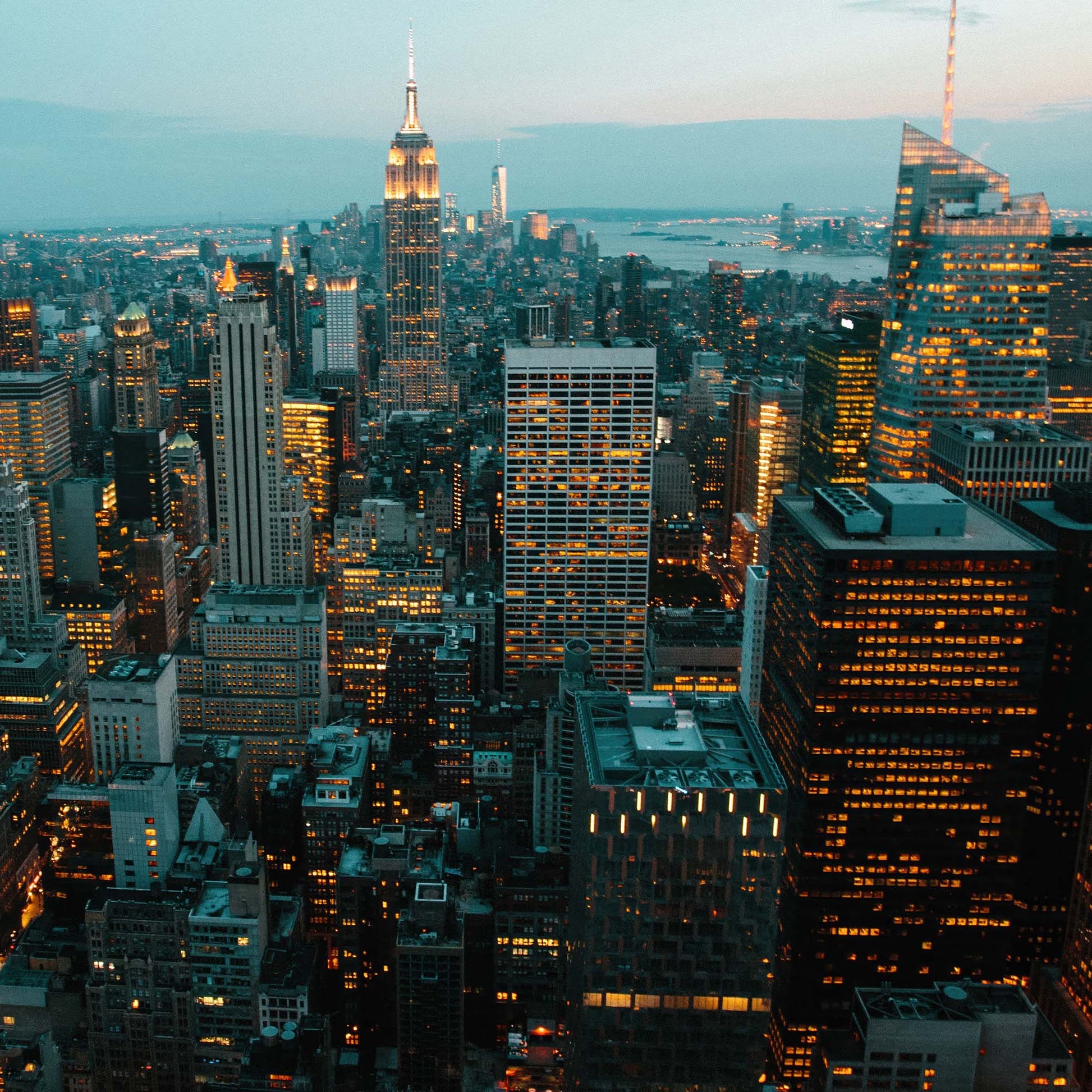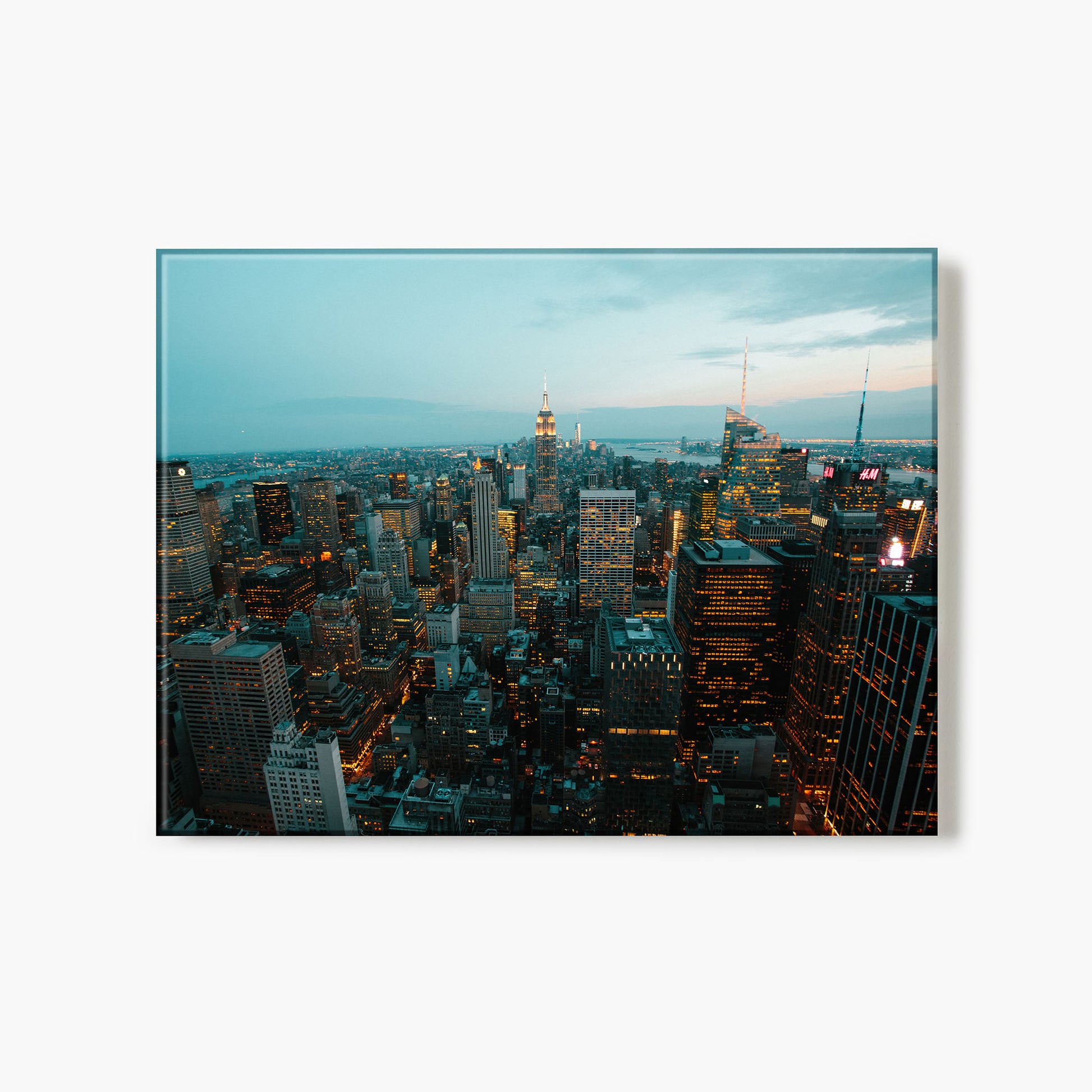 Concrete jungle vibes. Ryan Longnecker's nighttime New York skyline features a cascade of skyscrapers and glowing orange windows against a soft blue sky. The scene at dusk adds and air of mystery to this urban cityscape.