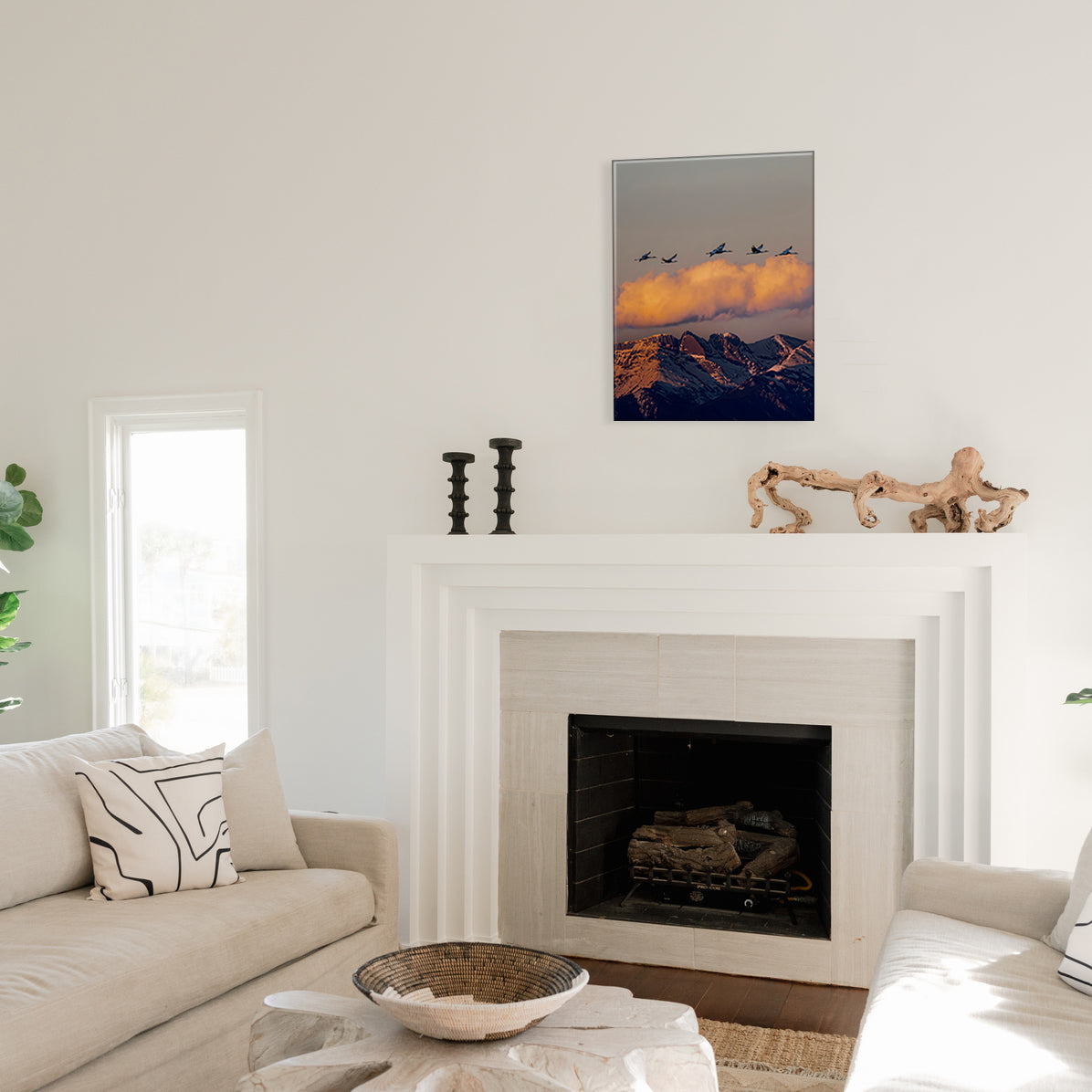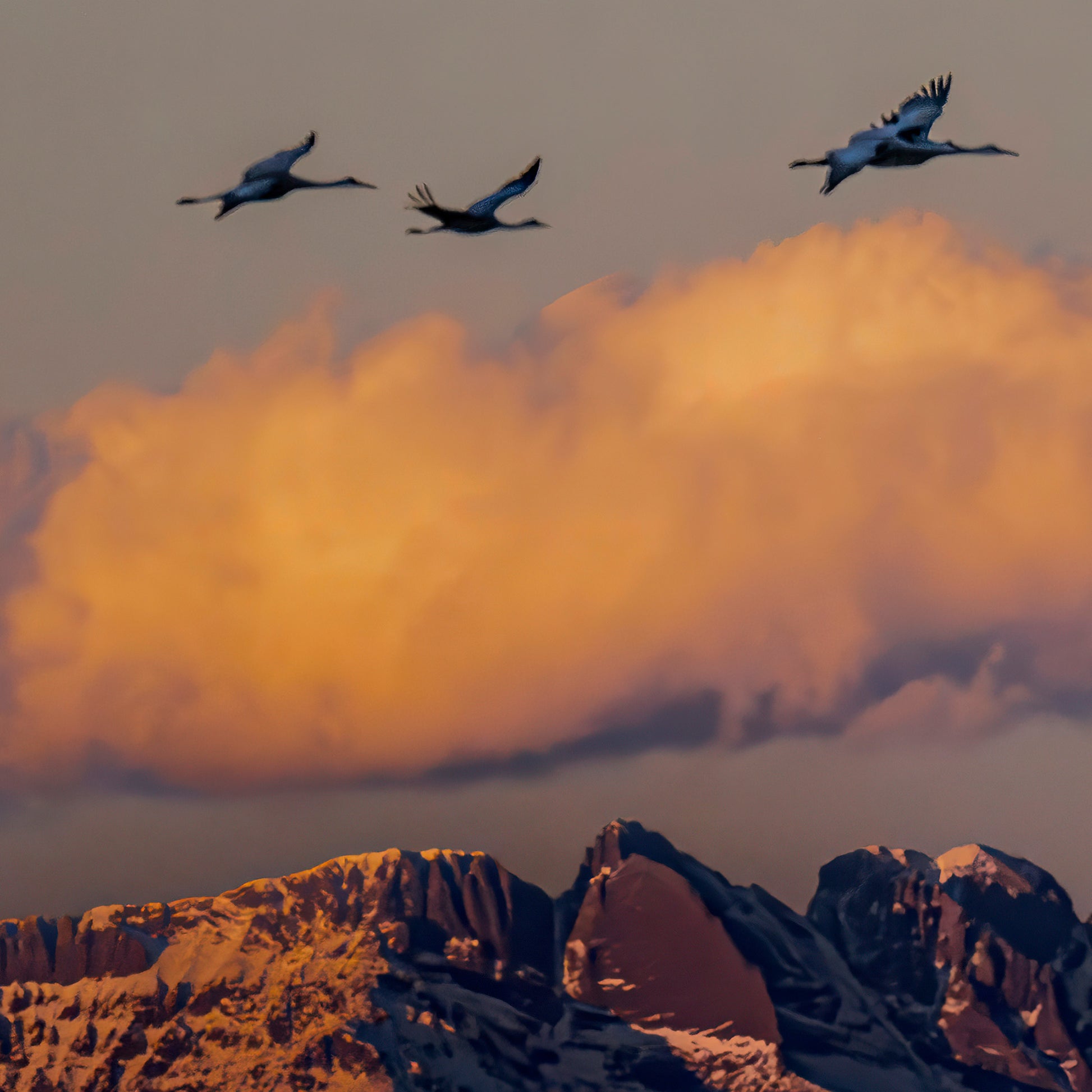Gavin Koester captures cranes mid-flight above a cluster of glowing clouds and a blaze of sunlit peaks. This is a photo so radiant, it practically soars off the wall.